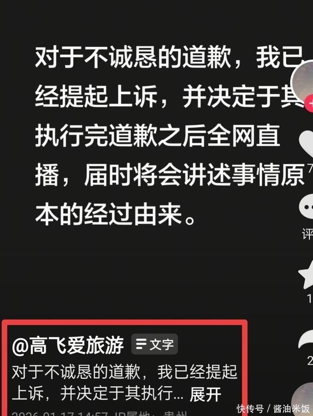 网传高某的疑似账号已公开,账号叫《高飞爱旅游》,他发了一个文案:对于不诚恳的道歉,我已经提起上诉,并决定于其执行完道歉之后全网直播,届时将会讲述事情原本的经过由来。